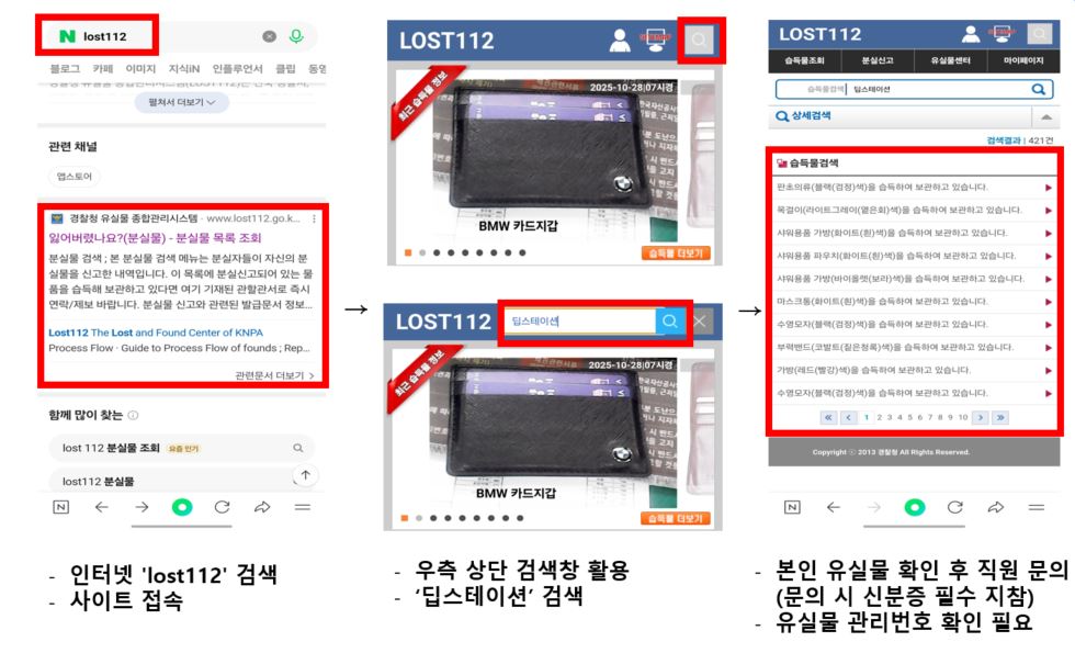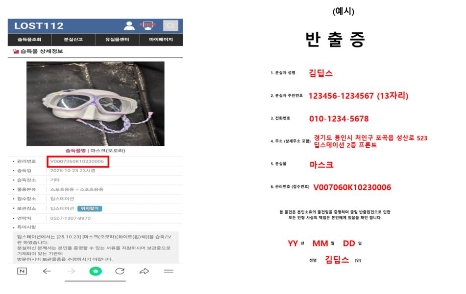 자주하는 질문 카테고리 전체예약운영및규정마일리지부이열린 분류 분실물 Total 1건 1 페이지 자주하는 질문 목록 Question(질문) 분실물 유실물 안내 Answer(답변) 당사에서는 아래와 같이 유실물이 관리 됨을 알려드립니다. - 개인물품의 분실 시 본인의 책임이며, 딥스테이션은 책임과 보관의 의무를 지지 않습니다.- 유실물은 5부 마감 후 일괄 수거 합니다.- 해당 유실물은 LOST119 경찰청 유실물 종합관리시스템에 등록합니다. 위 사이트에서 유실물을 검색하시어 찾으시고자 하는 물품이 있다면 딥스테이션에 방문하셔서 반출증 작성 후 수령하시면 됩니다. (아래 이미지 참고)- 수거한 유실물에 대한 개별적인 유선 또는 온라인을 통한 확인은 불가하며, 직접 방문하여 확인 및 수령 바랍니다. * 대리 수령시에는 위임장 제출이 필요합니다. 상세 페이지로 이동 검색 검색대상 제목내용제목+내용글쓴이글쓴이(코) 검색어 필수 검색 닫기